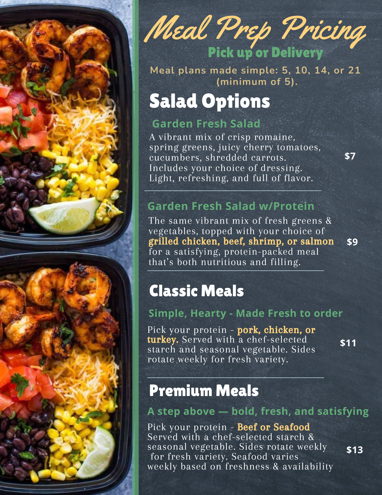 To keep things exciting, our menu variety changes each week based on what’s in season and available at peak freshness. Call or Text today to place your order or to receive this week’s offerings!